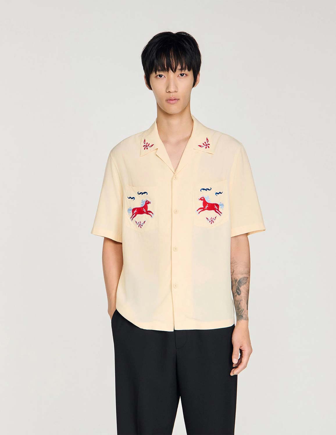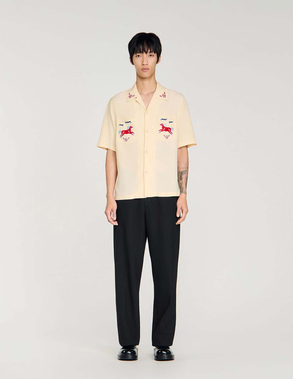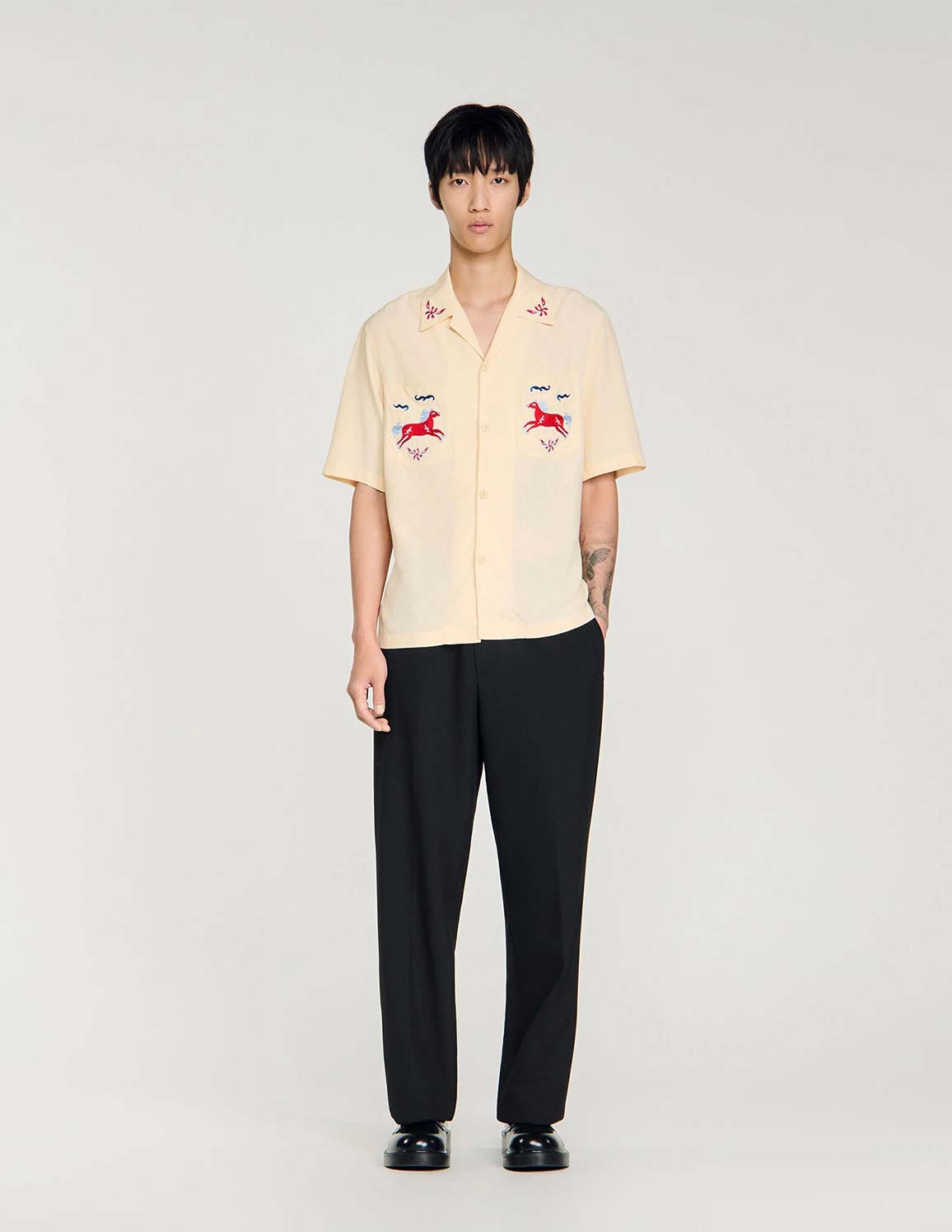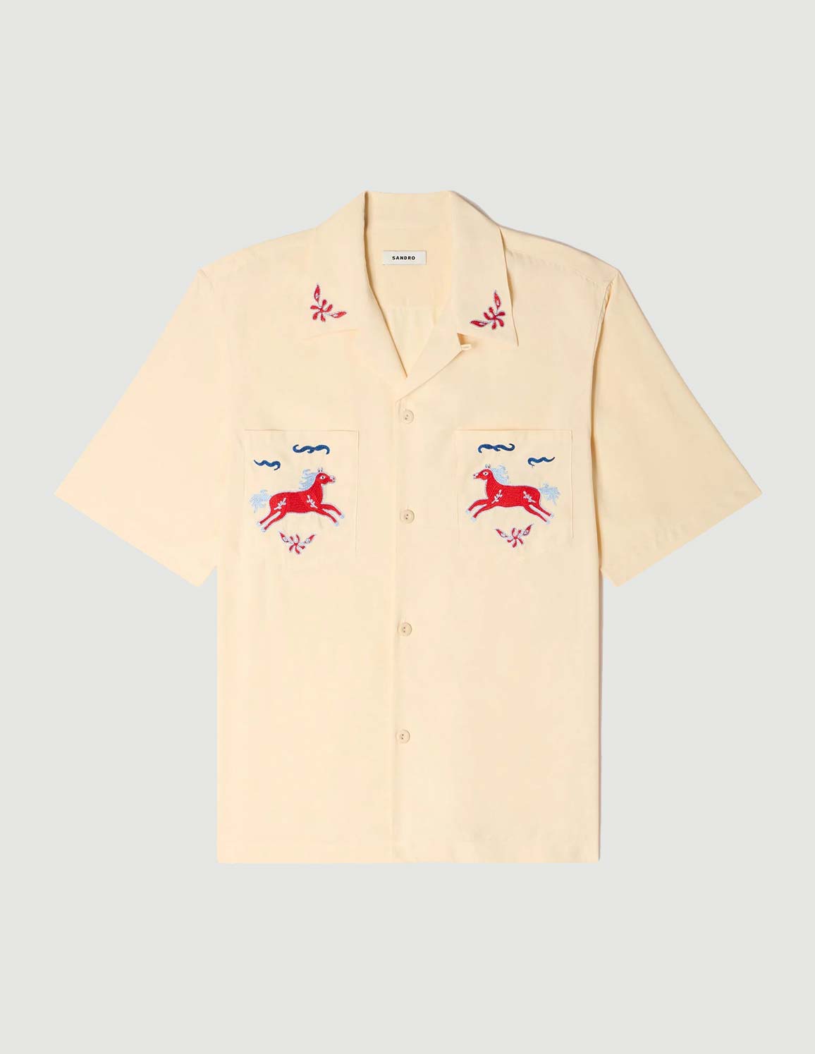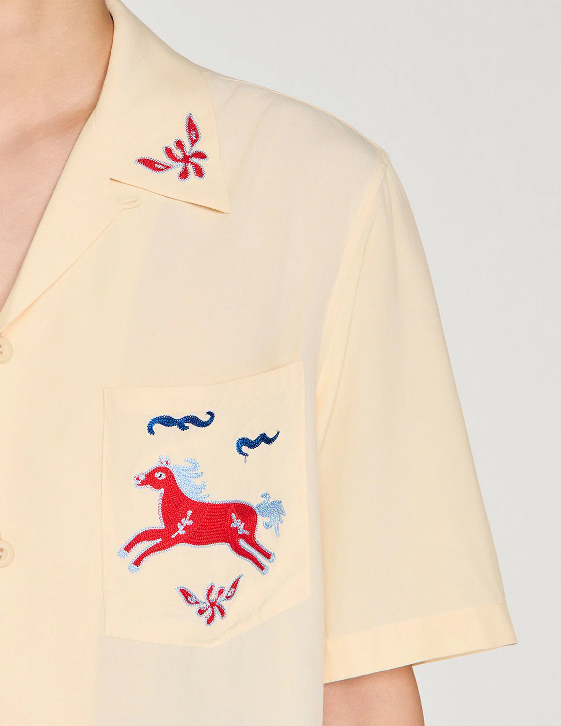 • Loose-fit shirt with an embroidered shark collar, short sleeves, and two patch pockets embellished with horse embroidery.