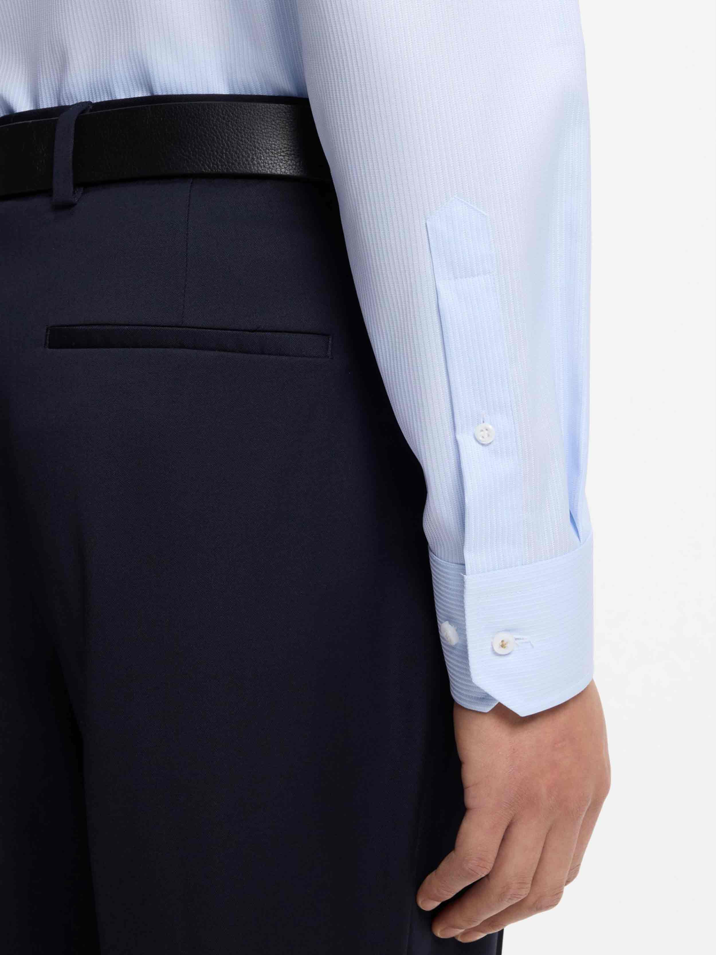 • Business shirt, regular fit with kent collar. Piping into collar attach and mother of pearl buttons.