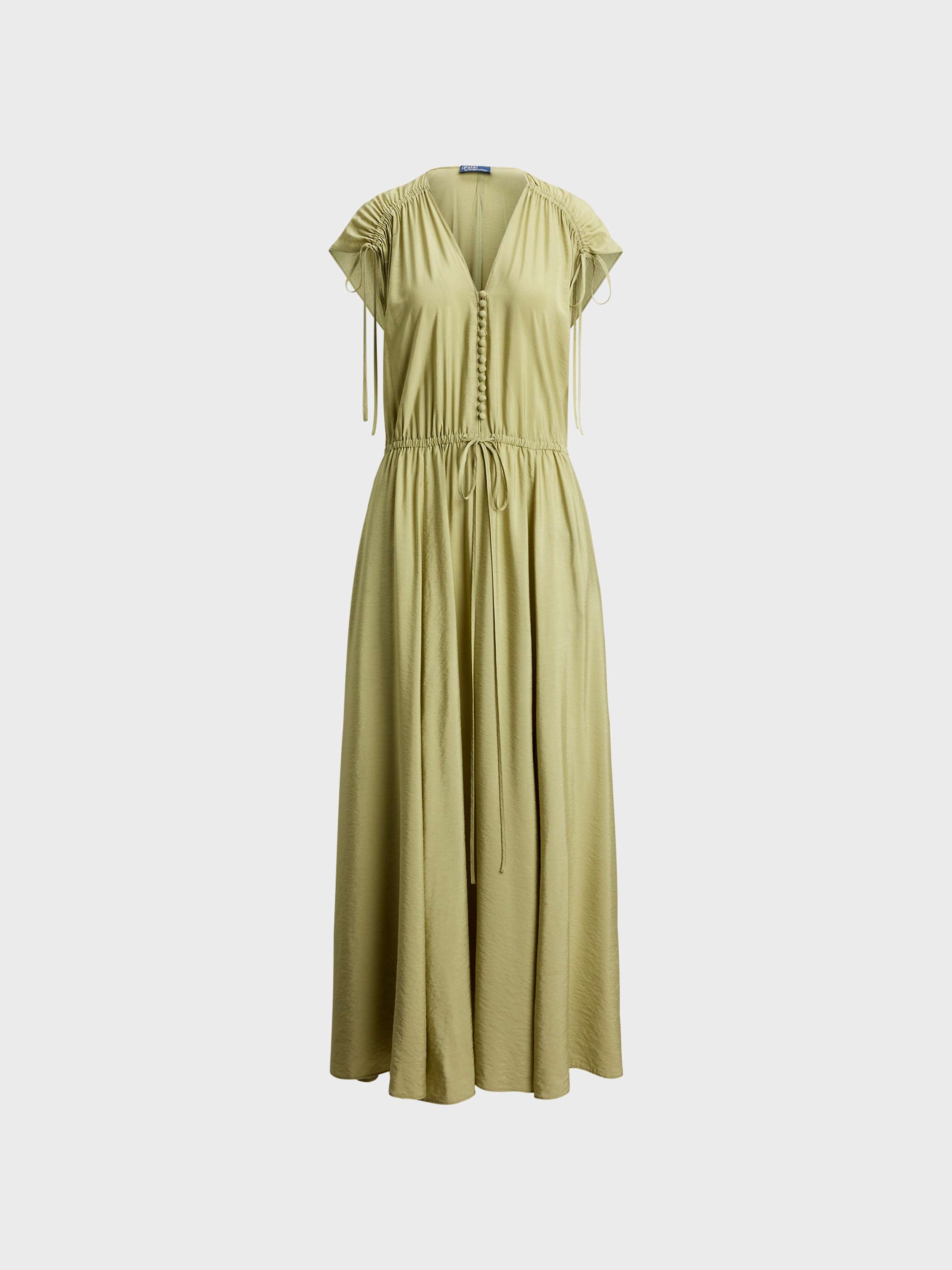 • Sleeveless silhouette. Shirred shoulders with self-ties allow for an adjustable drape.