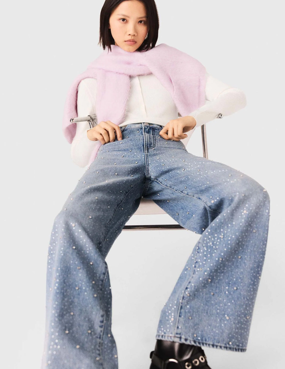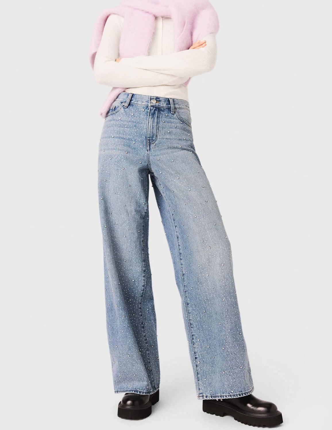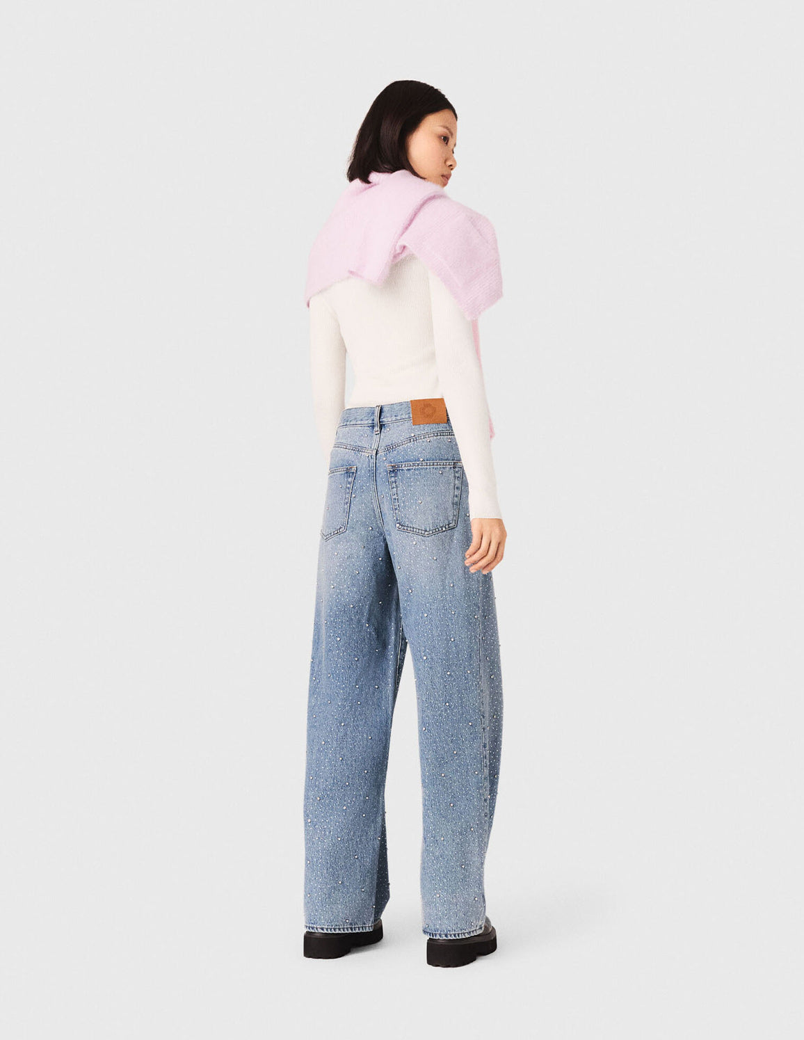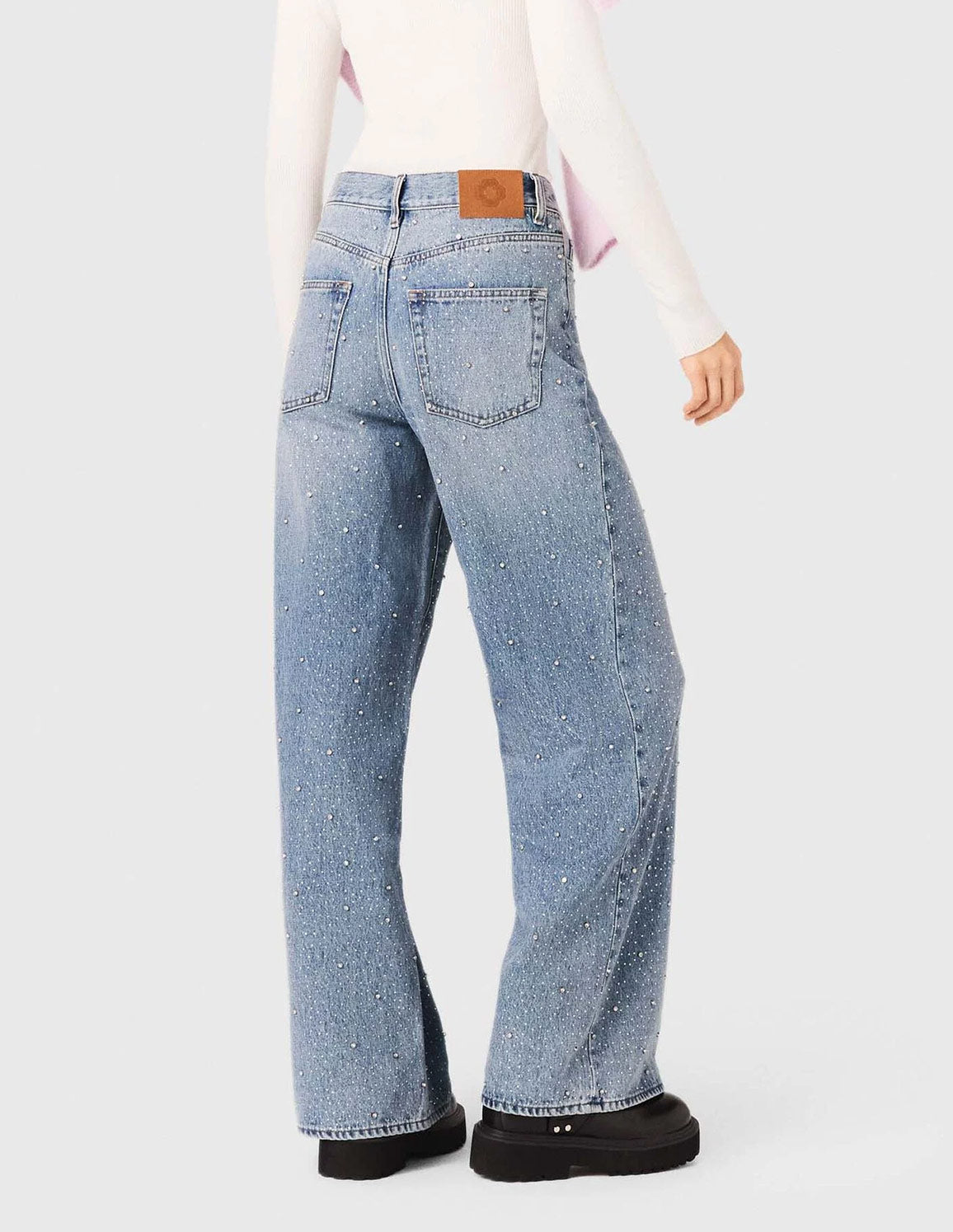 • These wide-leg, 100% cotton denim jeans stand out with sparkling all-over rhinestones, blending iconic style with contemporary sparkle. Their high-waisted cut structures the silhouette, while the signature patch on the back completes the look.