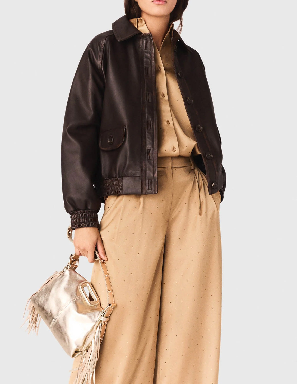 • For a coordinated look, pair them with the matching shirt and accessorise with leather pieces like a jacket and a Miss M mini bag for a chic, casual outfit.