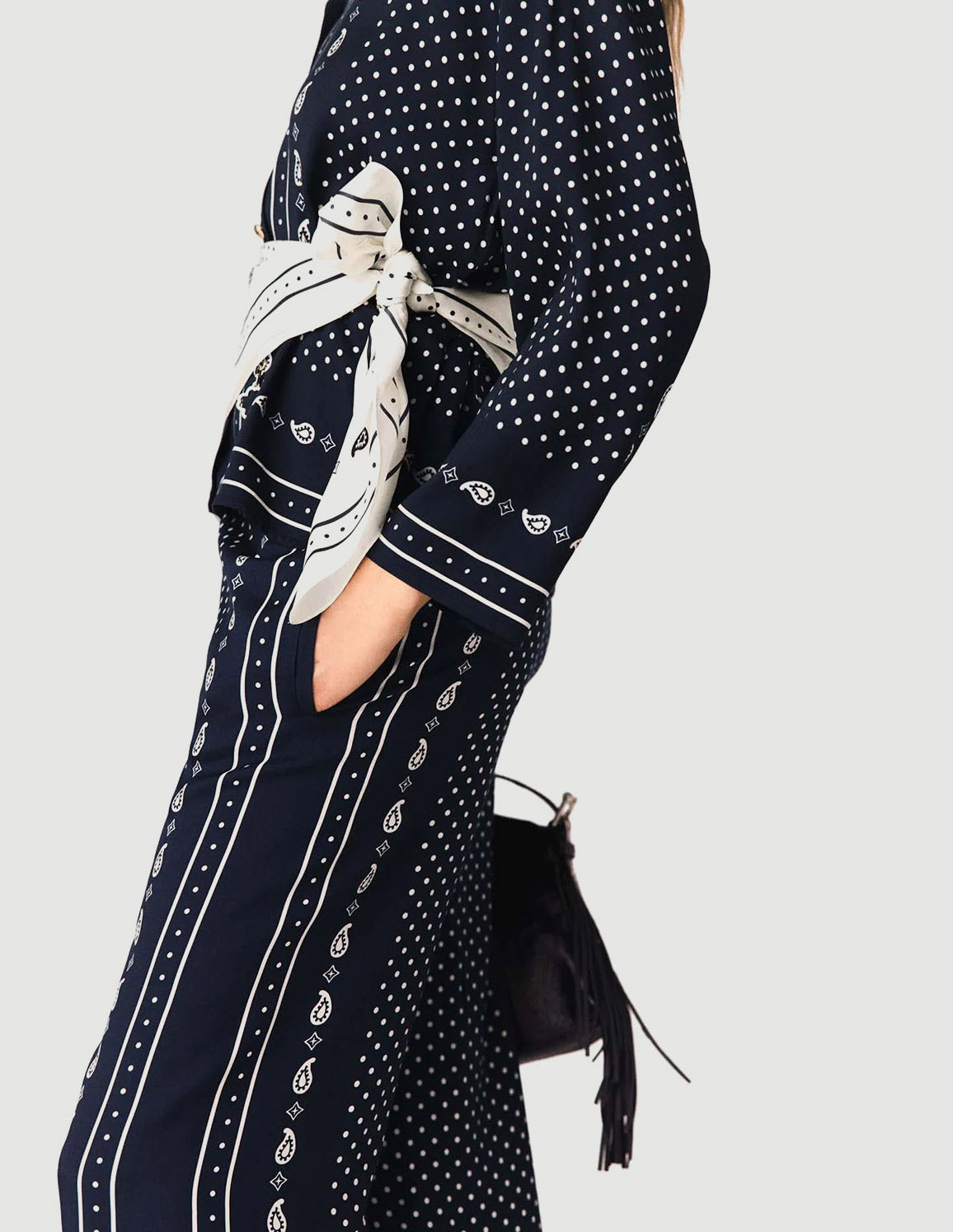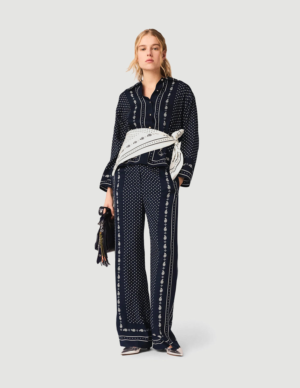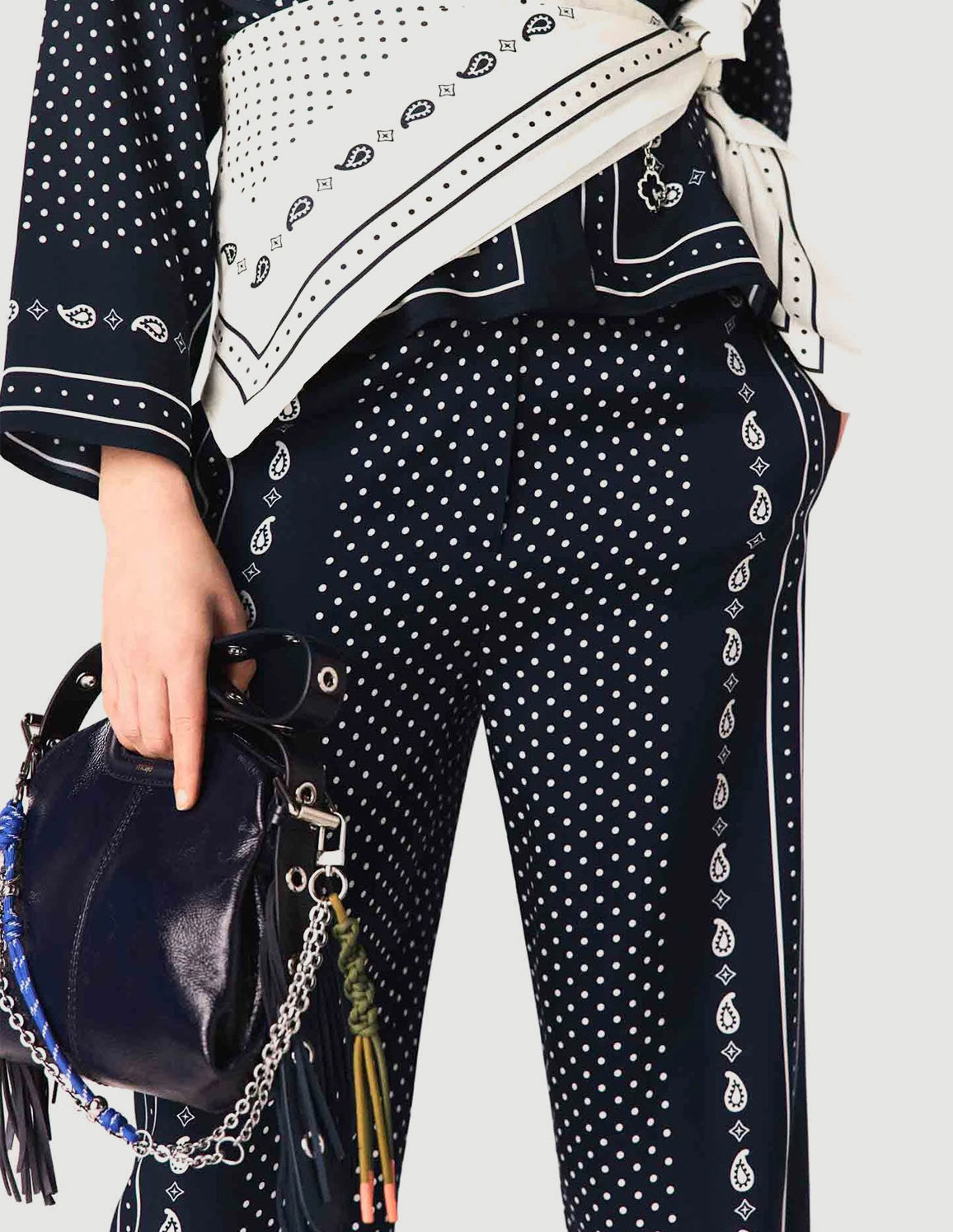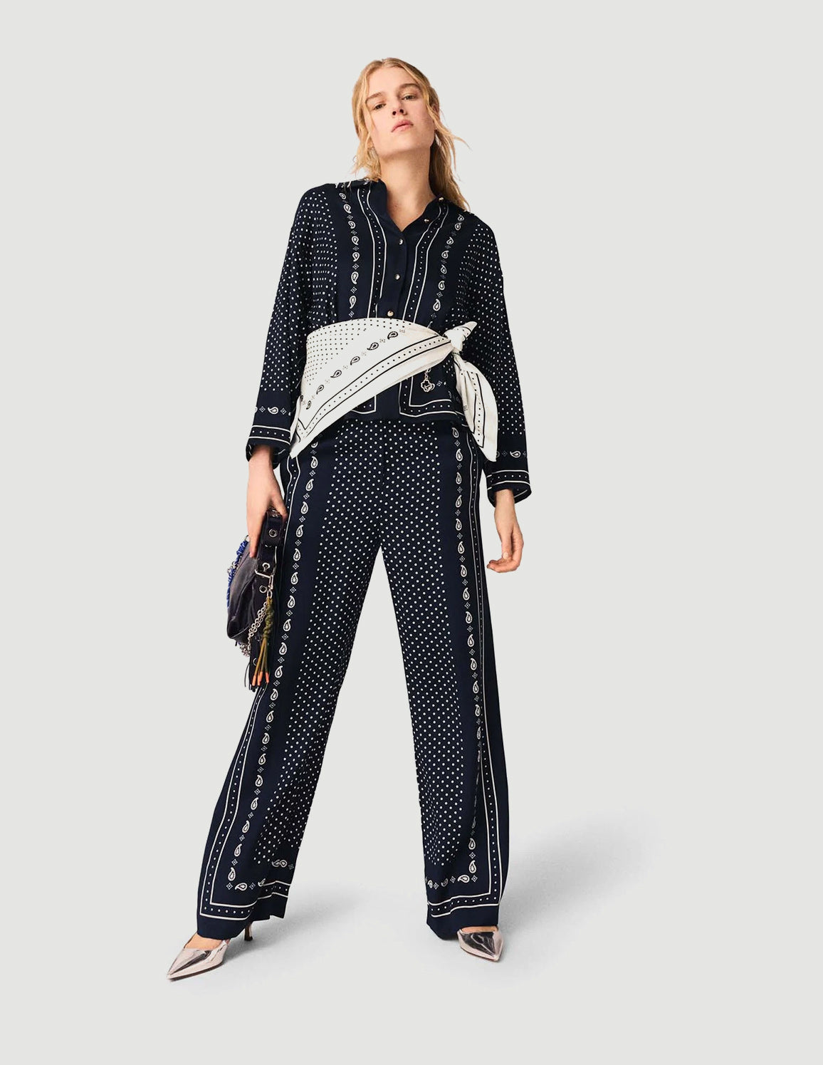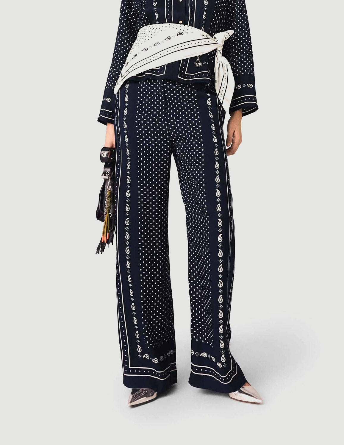• Flowy trousers with navy blue polka-dot bandana print