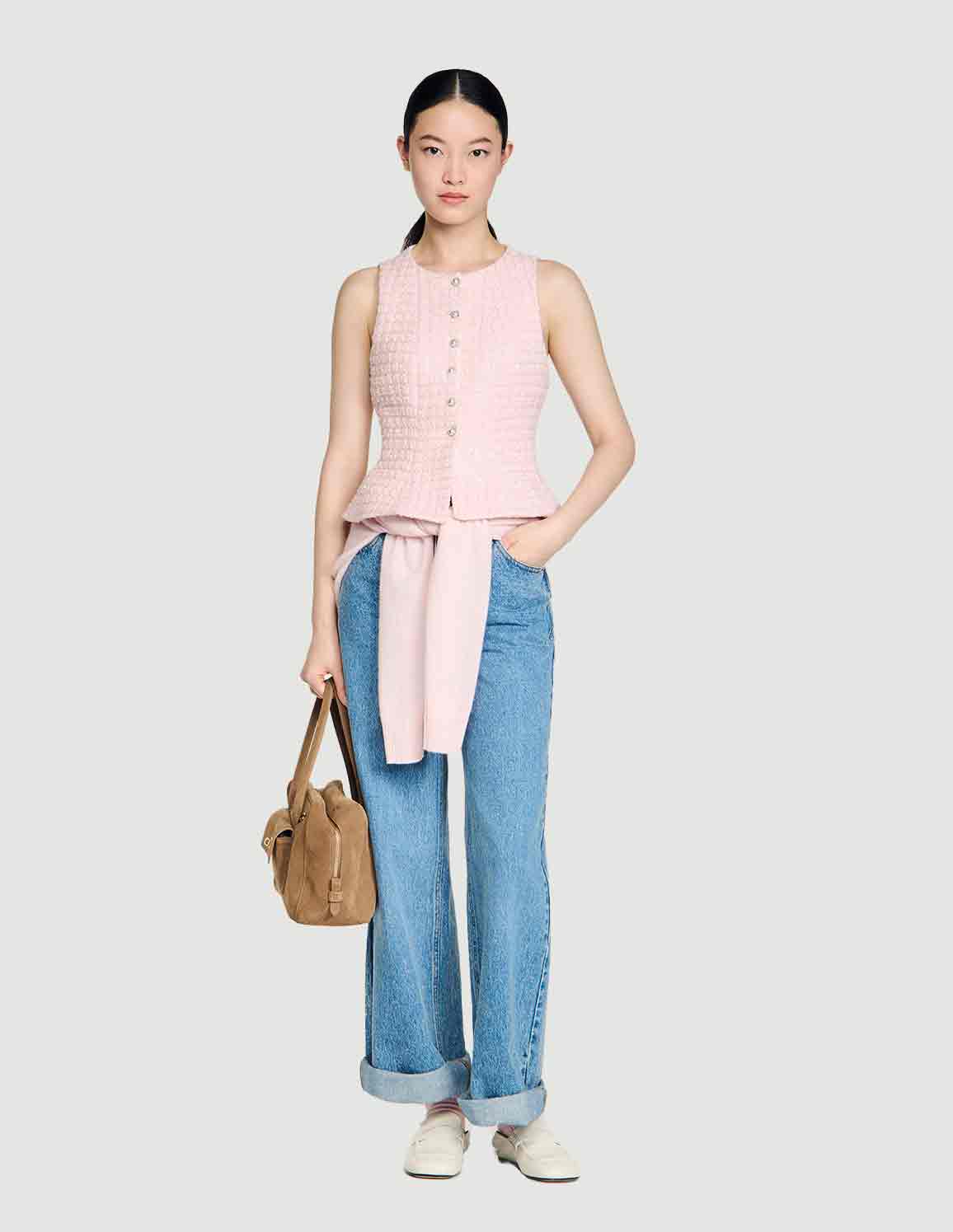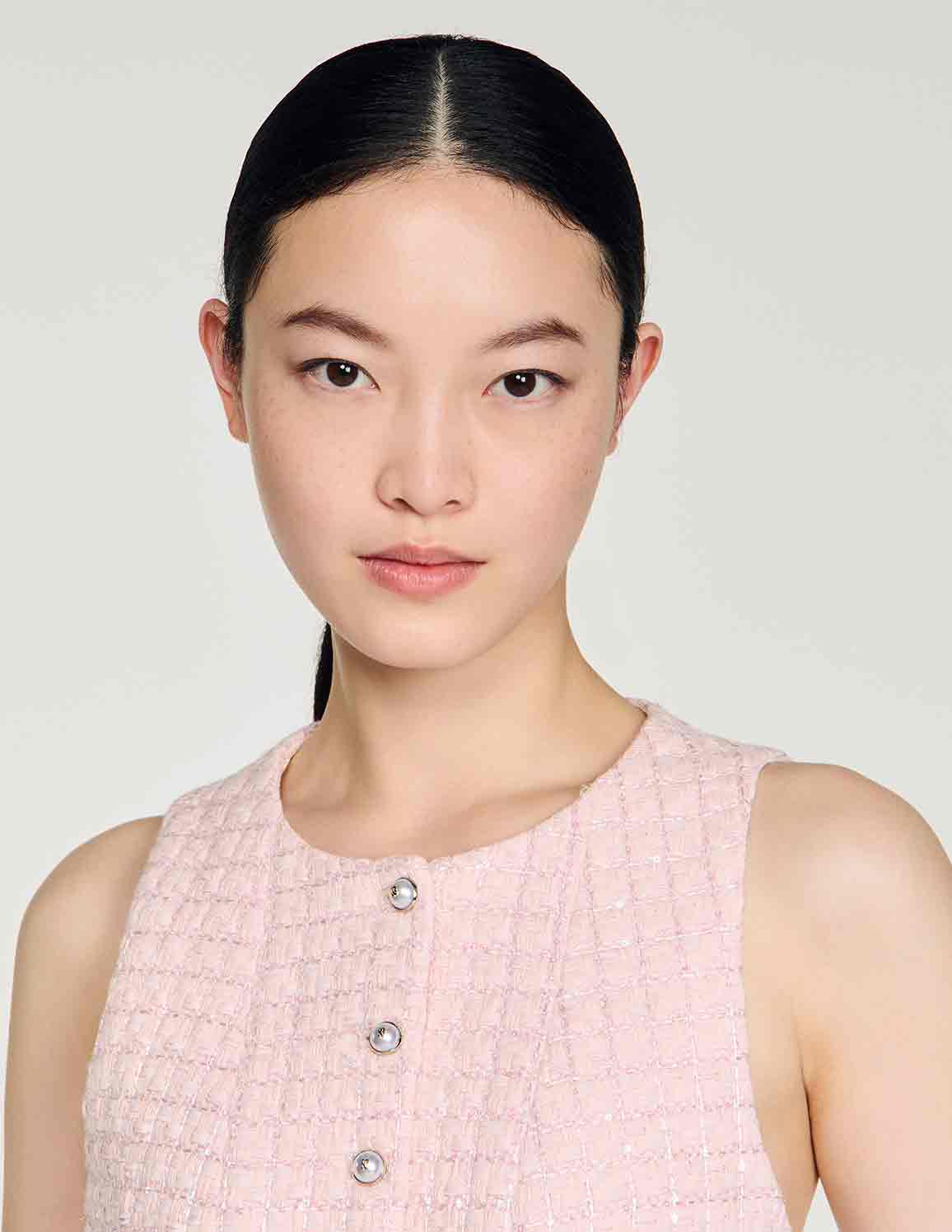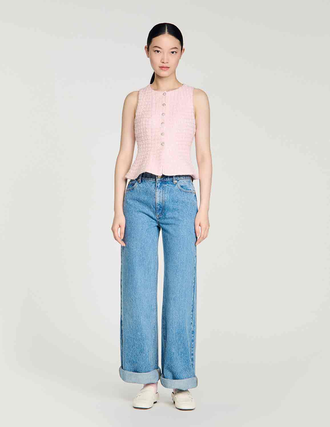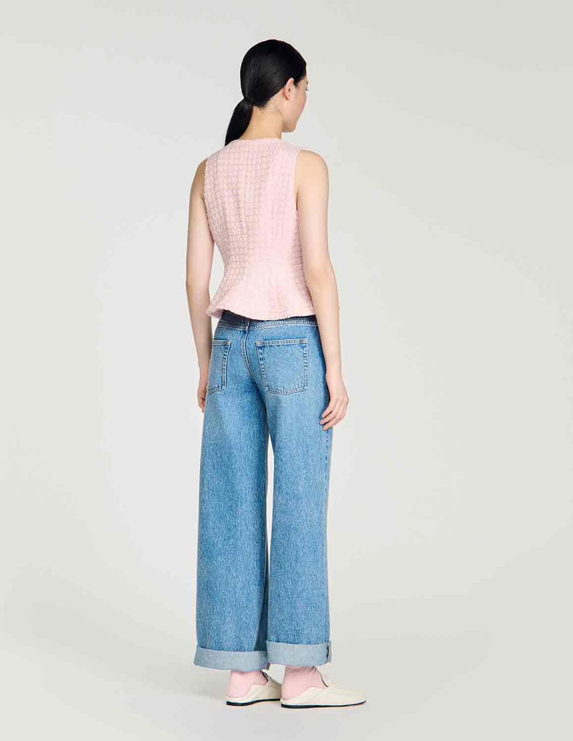 • Sleeveless tailored vest in sequinned tweed, featuring a peplum and decorative pearl buttons.
