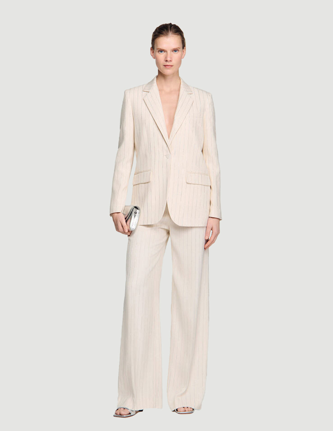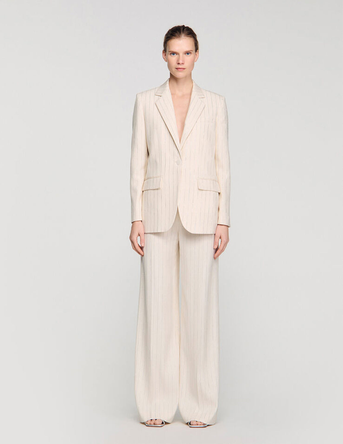 • Striped suit jacket with a tailored collar, long sleeves and a front button fastening.