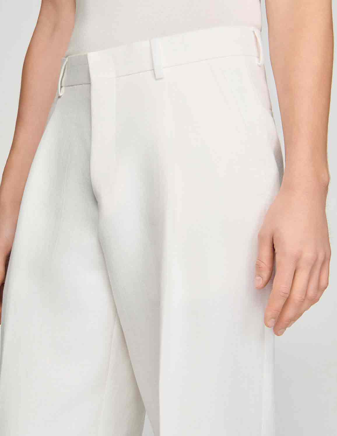 • Wide-leg linen suit trousers with front and back pockets.