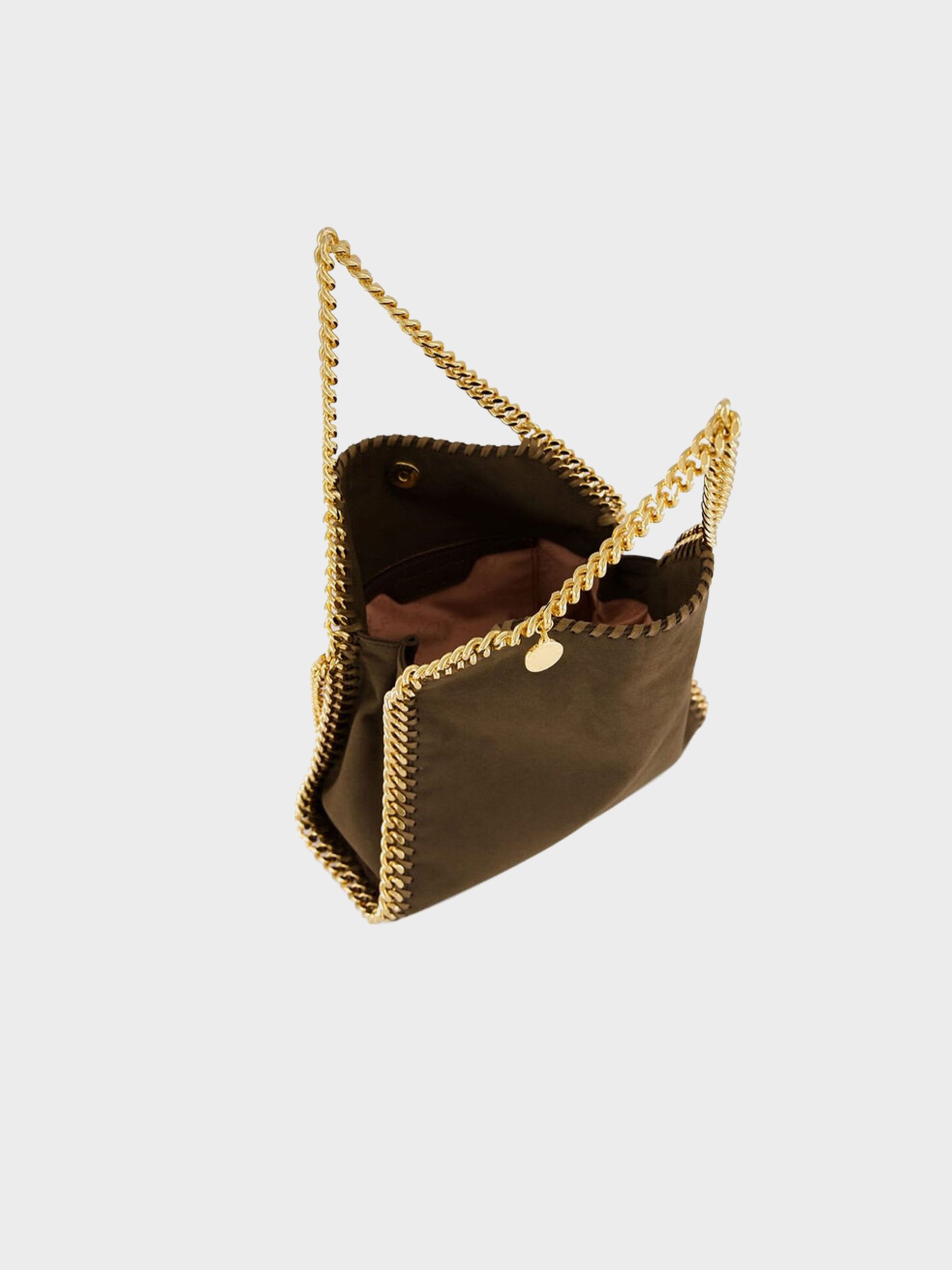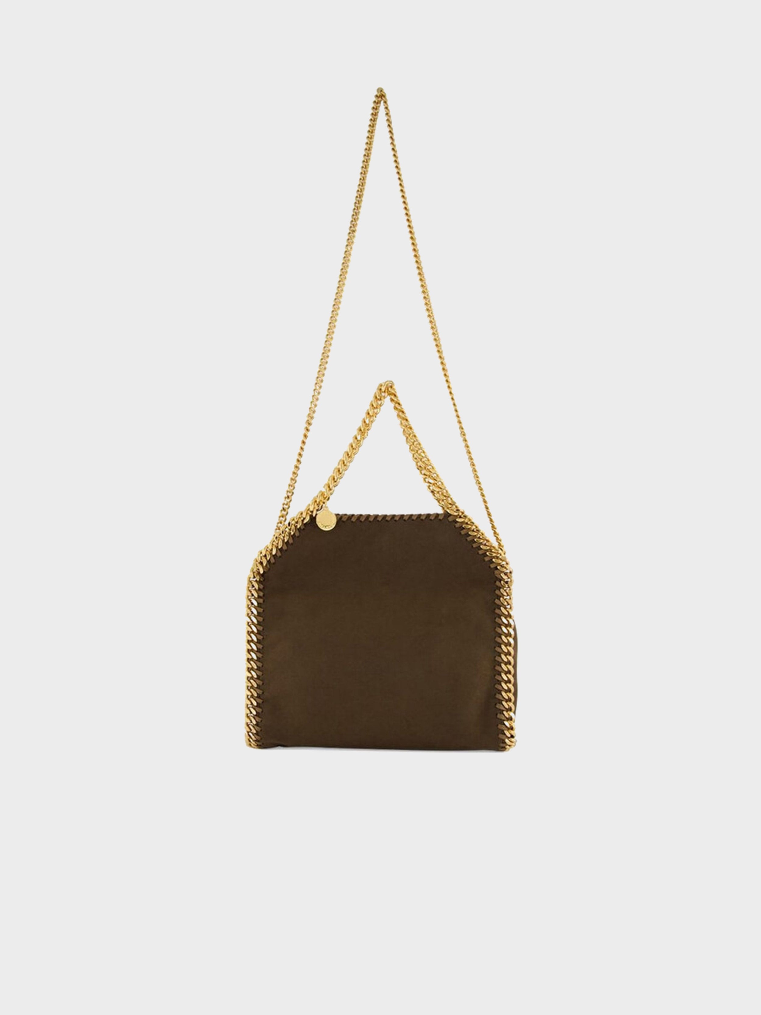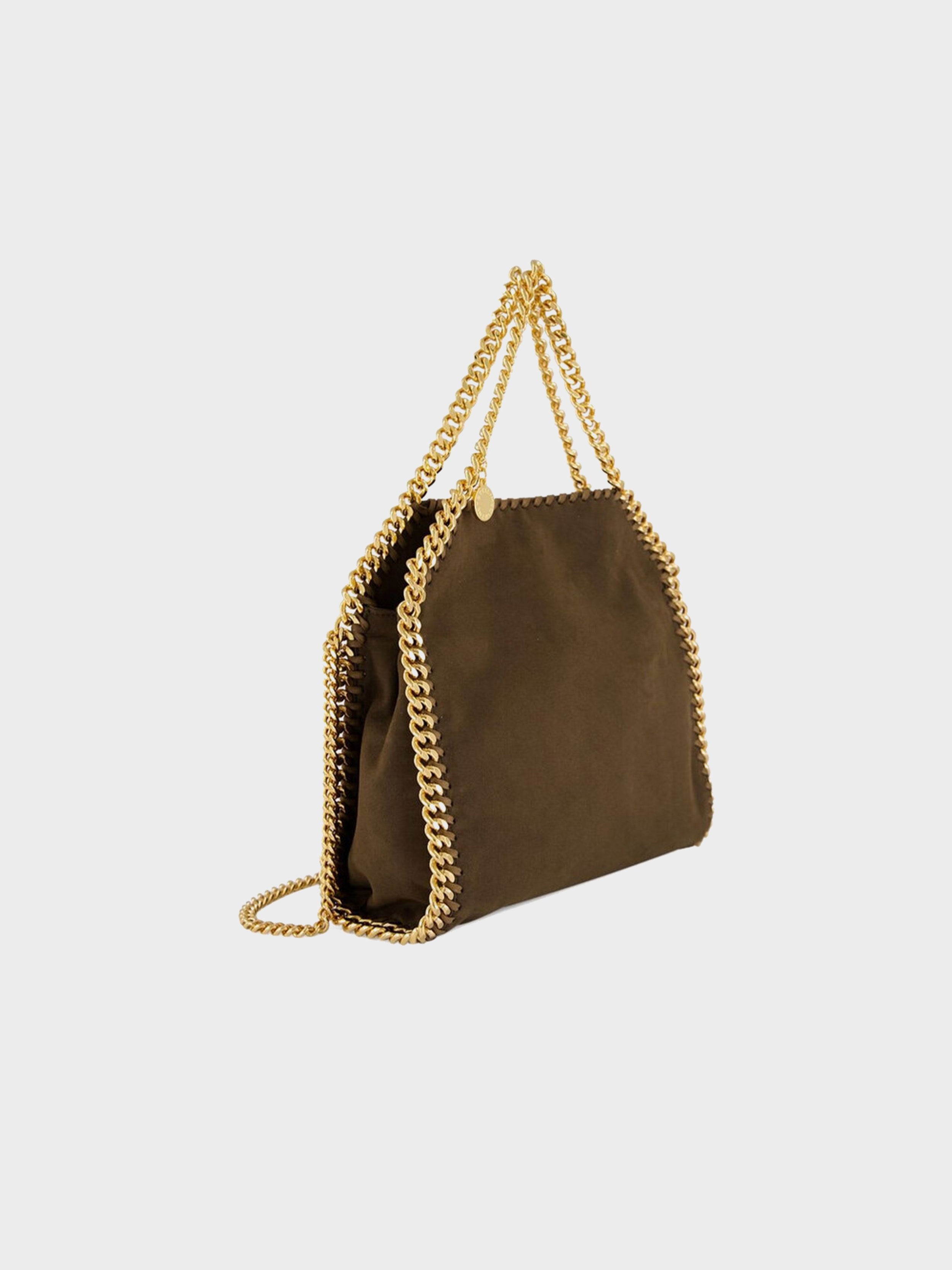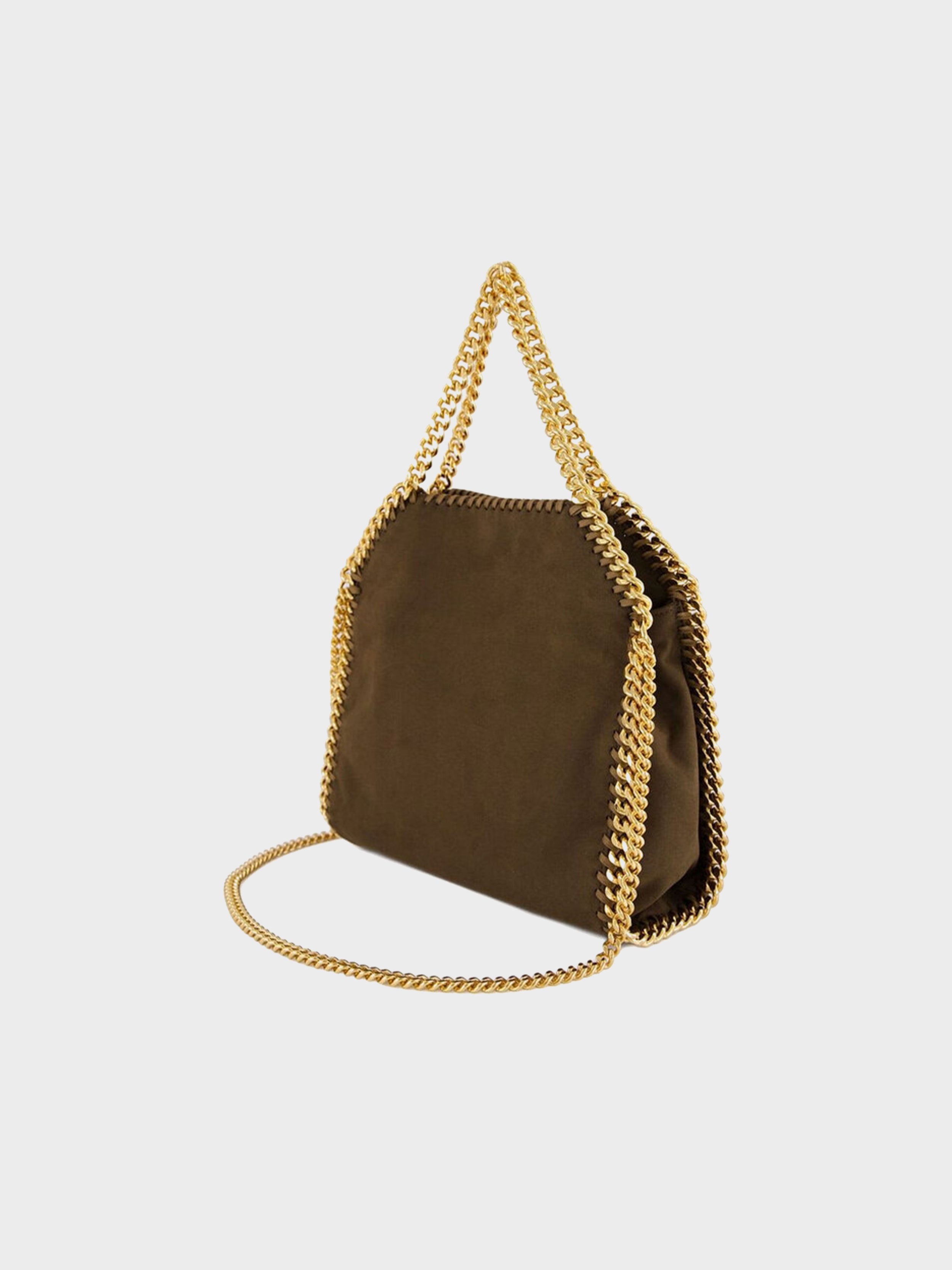 • A compact version of our iconic Falabella silhouette, this mini tote bag has just enough room to carry your daily essentials. Consciously crafted from our vegan alternative to suede, the slouchy tote is suspended from a recycled brass and recyclable aluminum chain. Stow your phone, wallet and daily essentials inside.