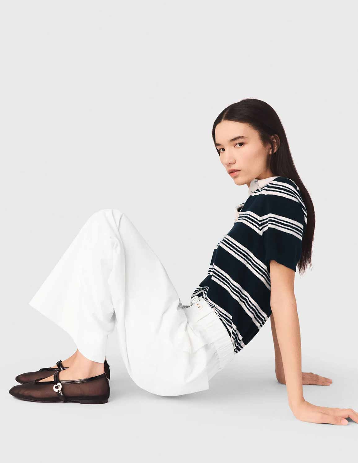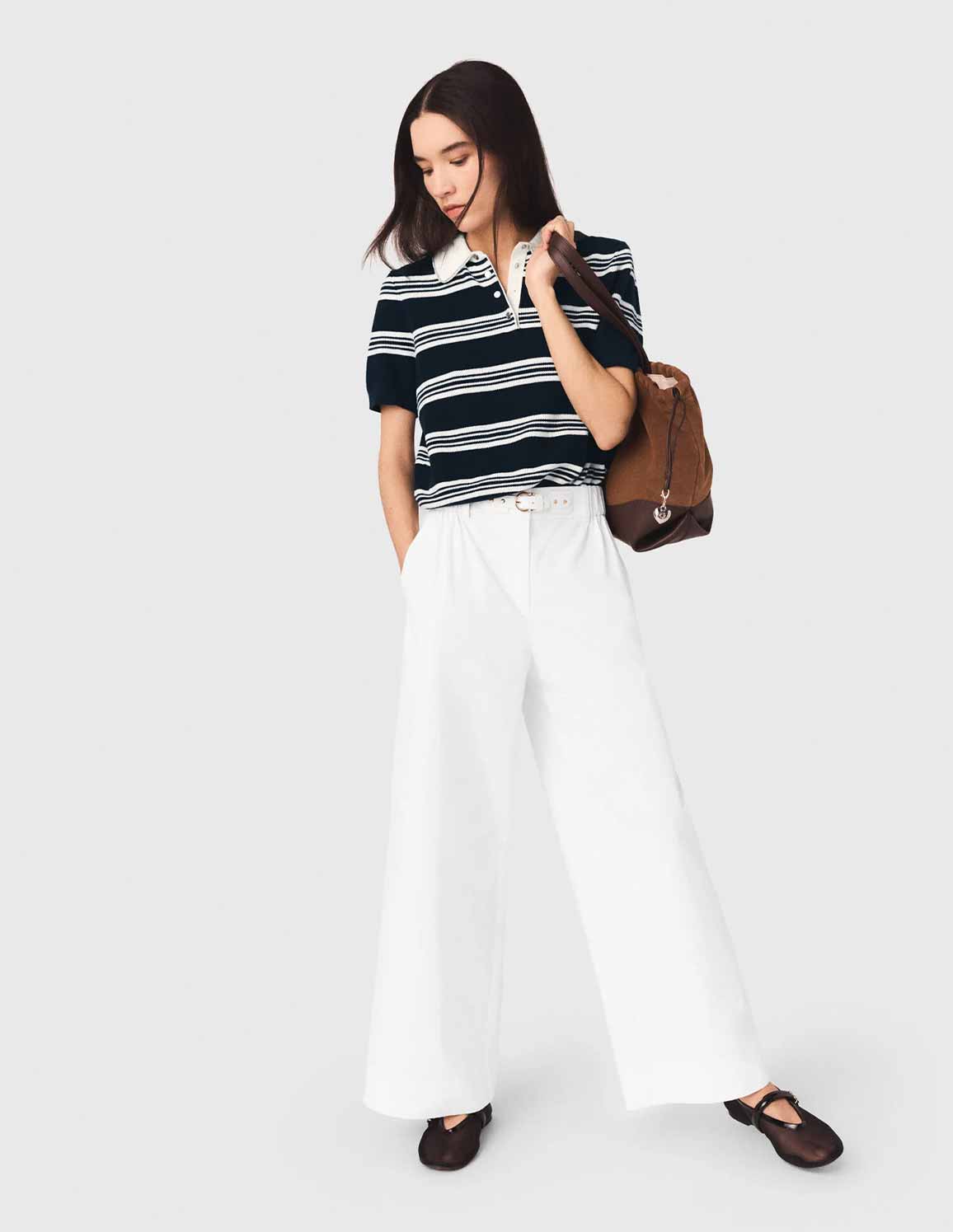 • These wide-leg white cotton trousers flatter the figure with their gathered high waist, flat front and thin belt, accentuated by a gold metal buckle and signature rivets. The Italian pockets and tonal topstitching combine functionality and sophistication for a look that is both structured and casual.