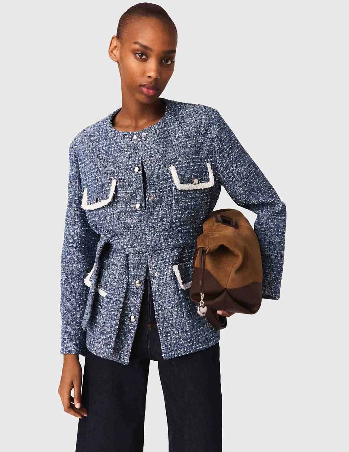 • Designed in a blue and white marled tweed, it has a straight cut, four patch pockets highlighted with ecru bouclé trim and a tie belt, for a structured and refined look. The silver press-studs and the clean finish of the edges create a chic style.