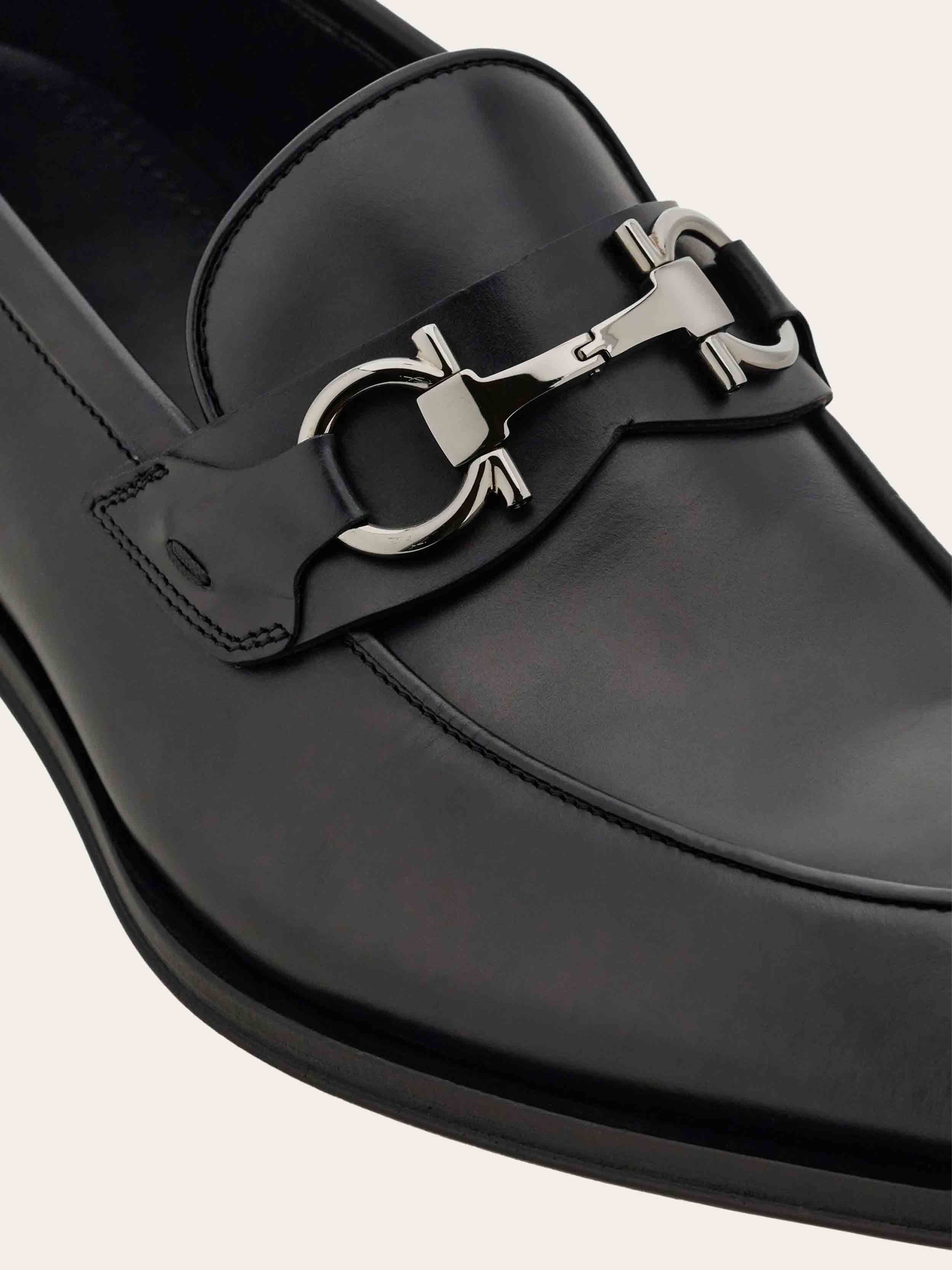 • With raised stitching around the camp and a slightly elongated tip, this new Gancini loafer has a formal feel. The instep is detailed with an equine style Gancini buckle, while the smooth leather upper features a subtle two-tone shading at the toe. This shoe features the Blake construction, whereby the upper is stitched directly to the outsole resulting in a slimmer profile with a more streamlined look and a flexible finish.
