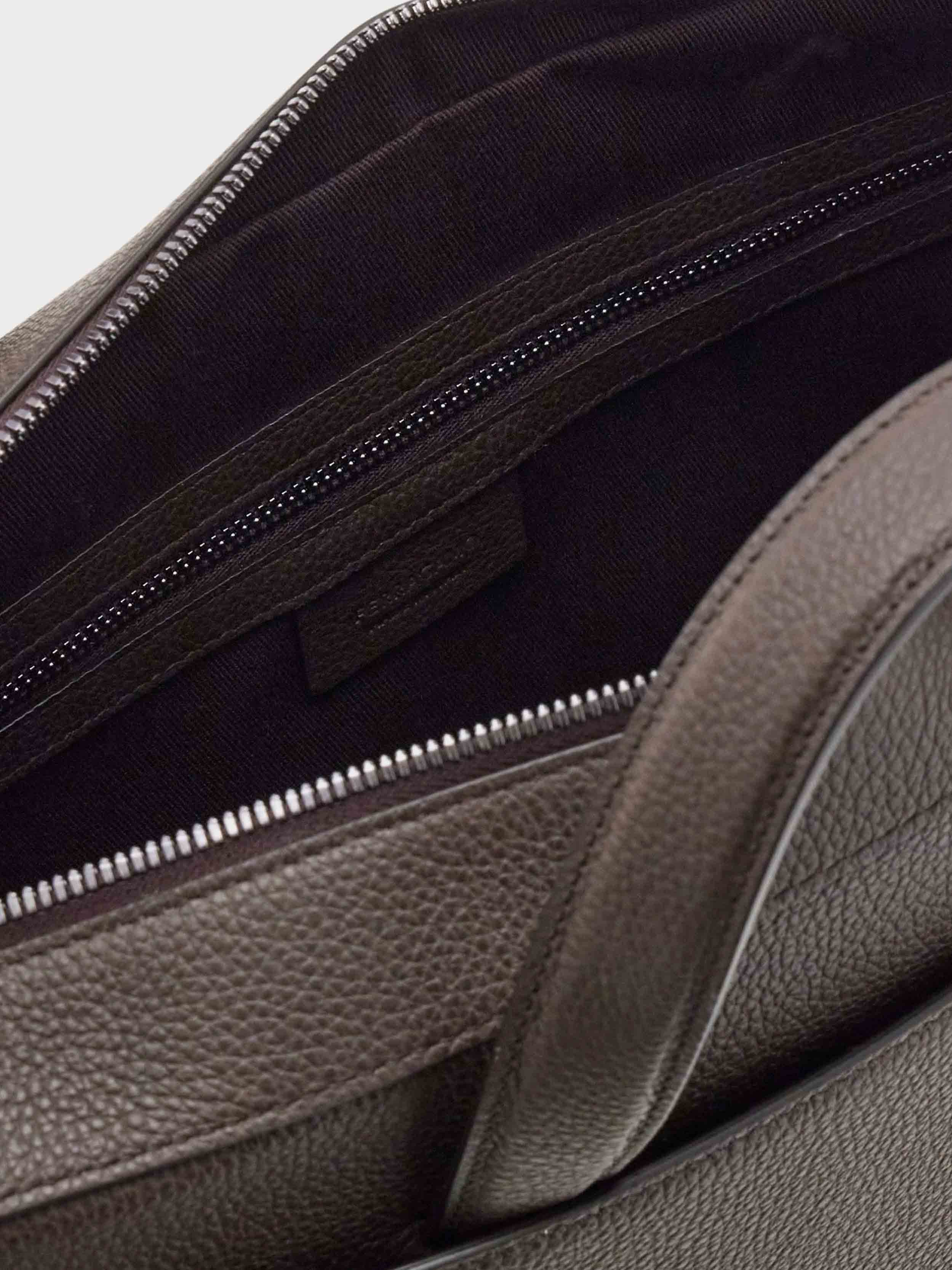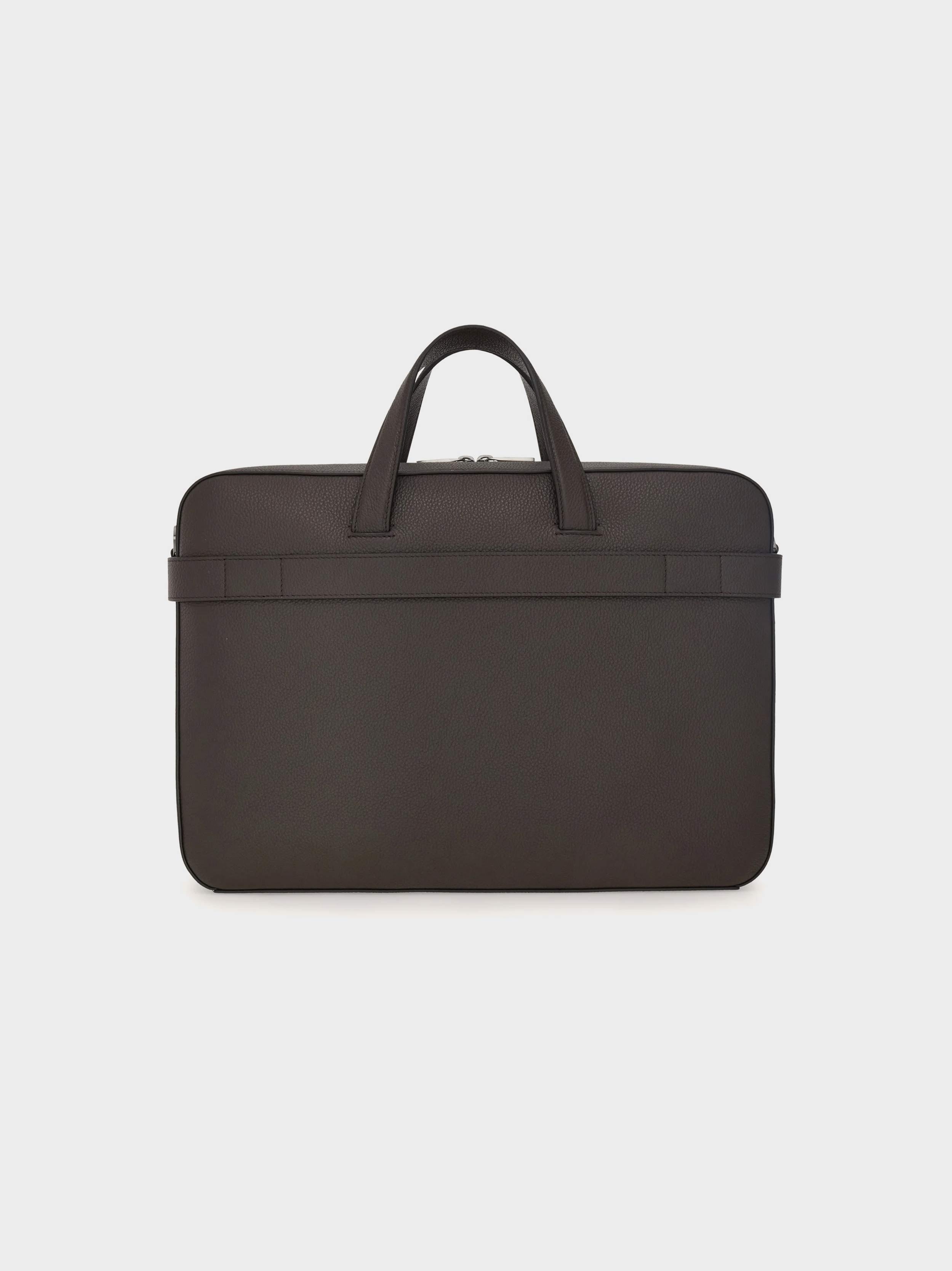 • New business bag crafted from hammered calfskin with a soft, exquisite feel. Spacious and versatile, it opens via the metal zip and features a lined interior, complemented by flat pockets and spaces for your personal items. The two Hug buckles with a painted finish provide the fastening for the large flat front pocket. Carry it by hand or over the shoulder with the detachable and adjustable strap.