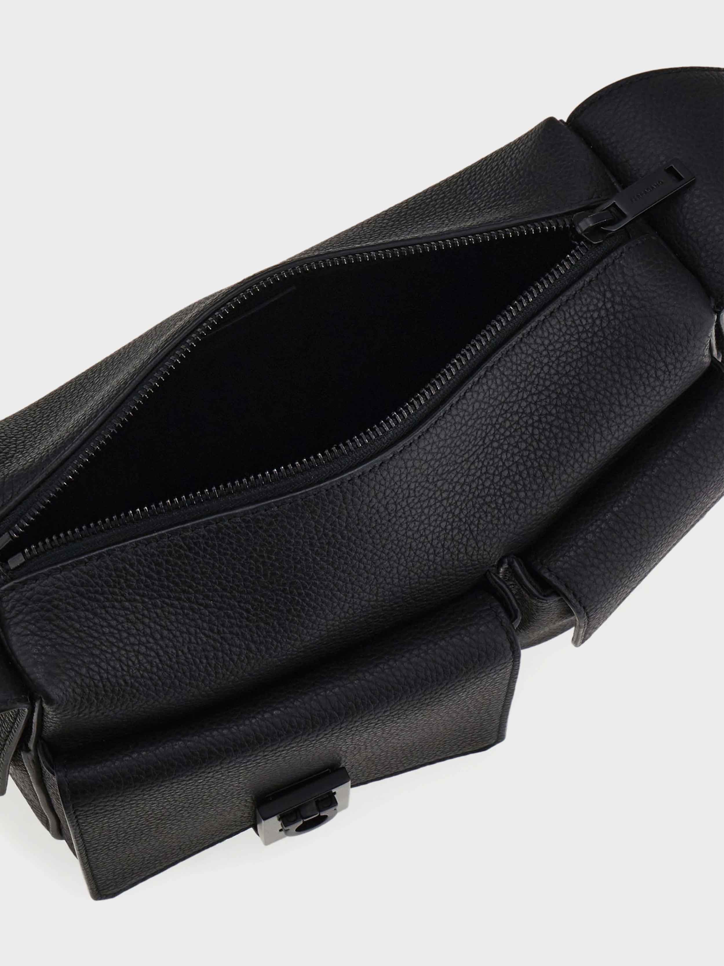 • Practical chic. New Ferragamo crossbody bag cut from hammered calfskin. The texture of the leather echoes a luxurious look with utilitarian details such as the large front pockets and custom jacquard strap. The Hug clasp on the large pocket seals the deal.