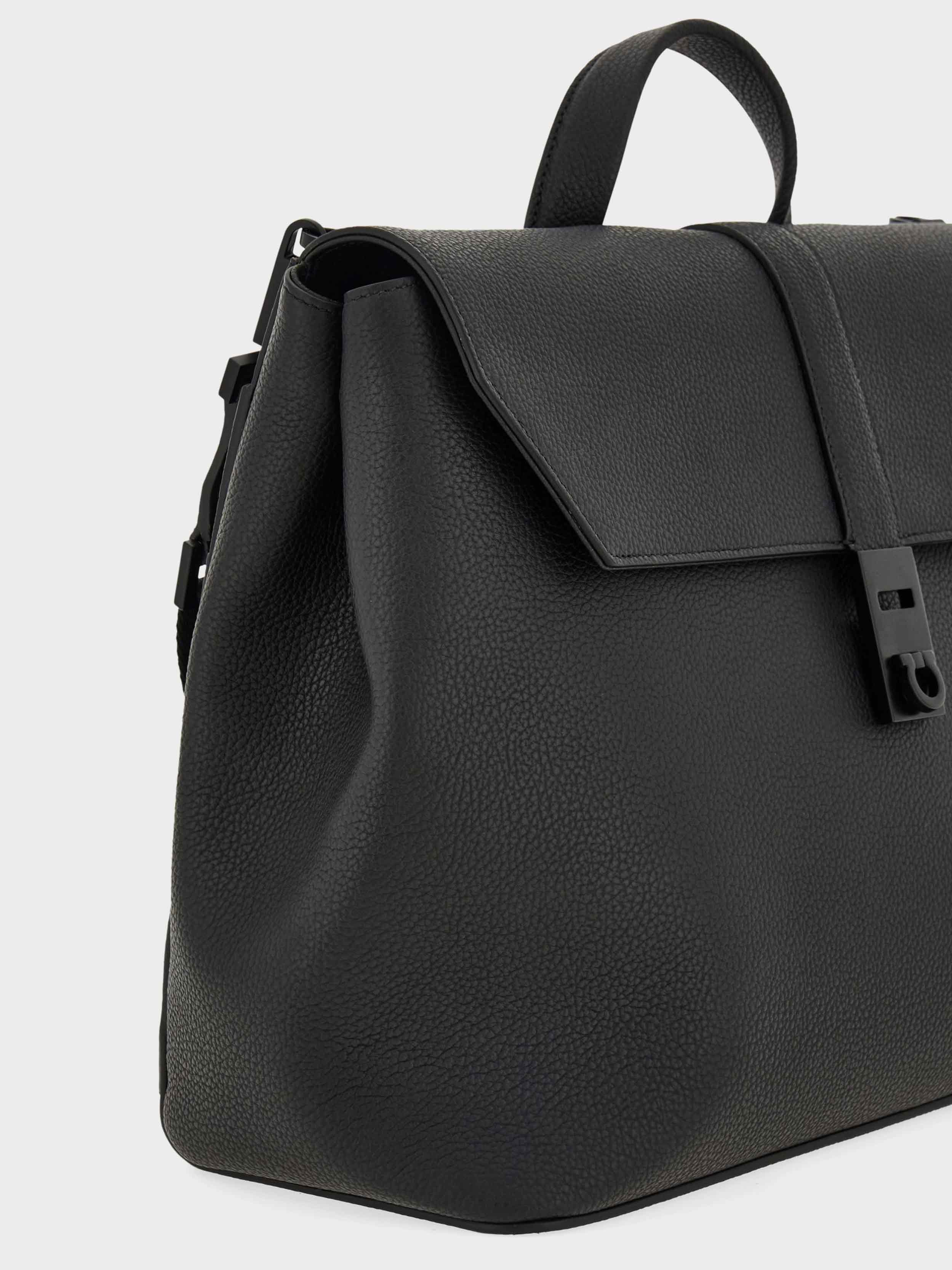 • relaxed silhouette and a luxurious touch, this new hammered calfskin briefcase combines elegance and versatility. The design features side gussets, a front flap secured by a tonal matte Hug clasp, and a back flap pocket for additional storage. Its true strength lies in its triple carrying versatility: it can be worn as a shoulder bag, as a backpack thanks to the removable straps, or carried by hand as a classic briefcase. A practical back strap also allows it to be attached to trolley luggage, making it the perfect companion for travel.