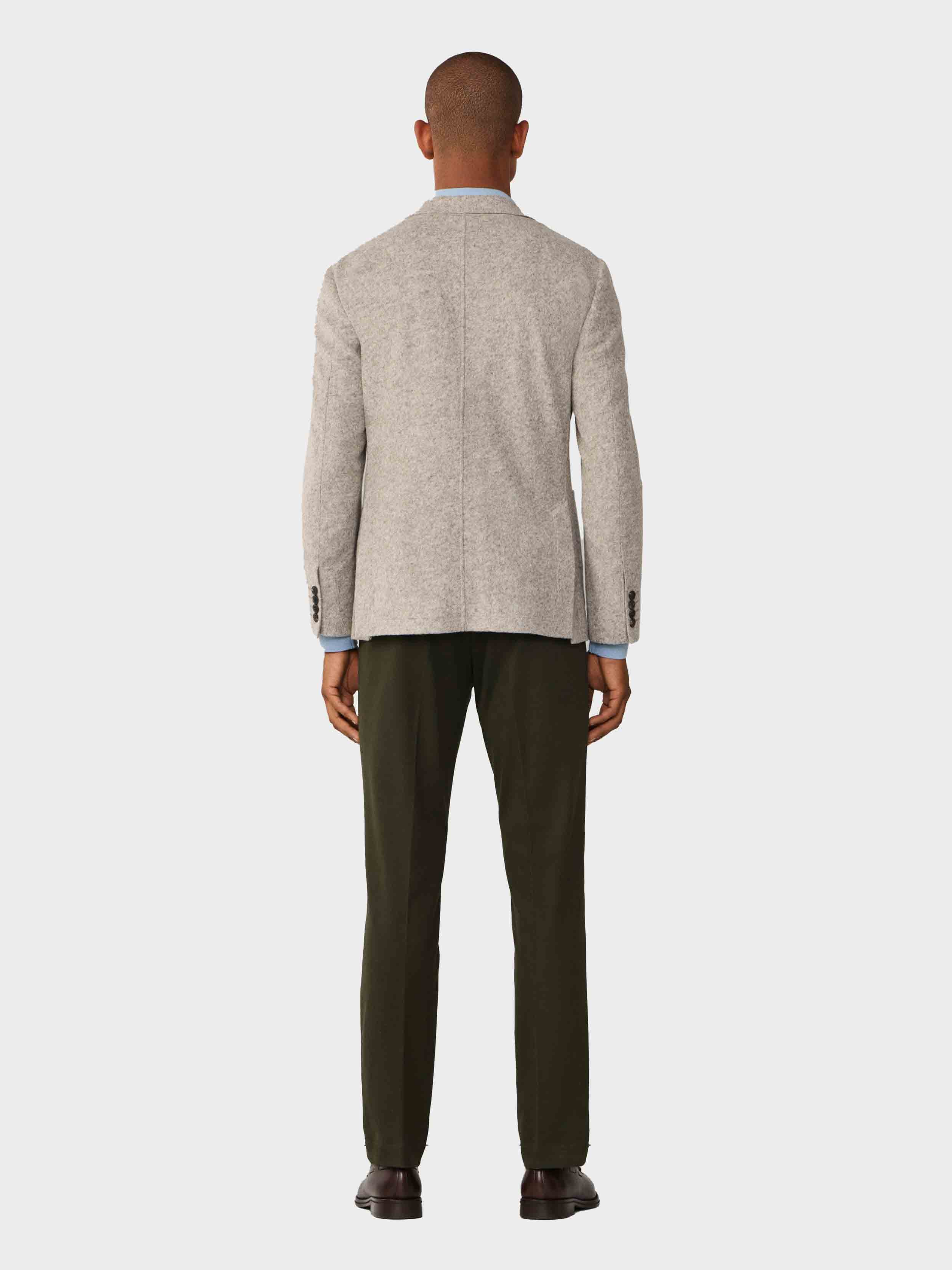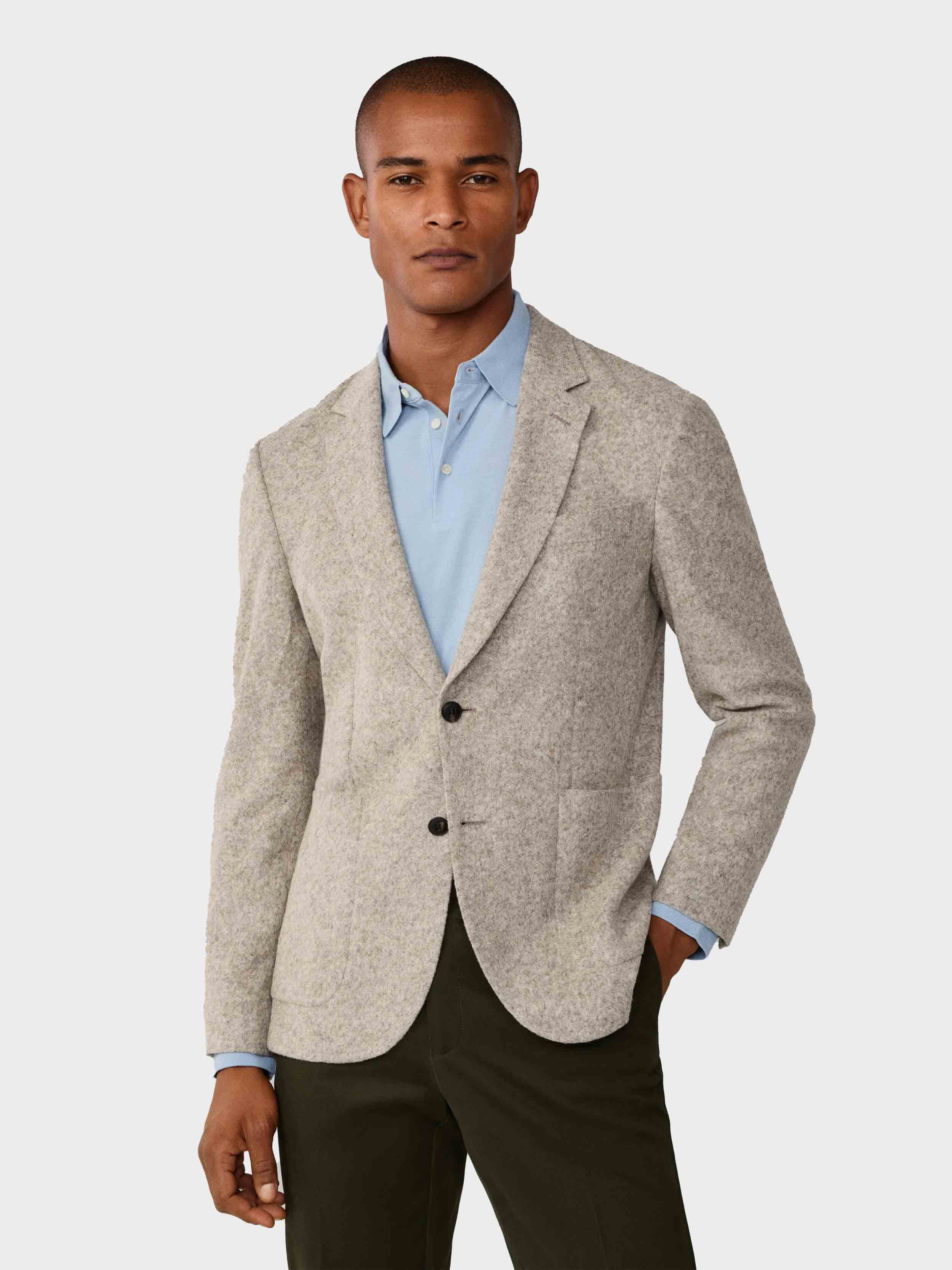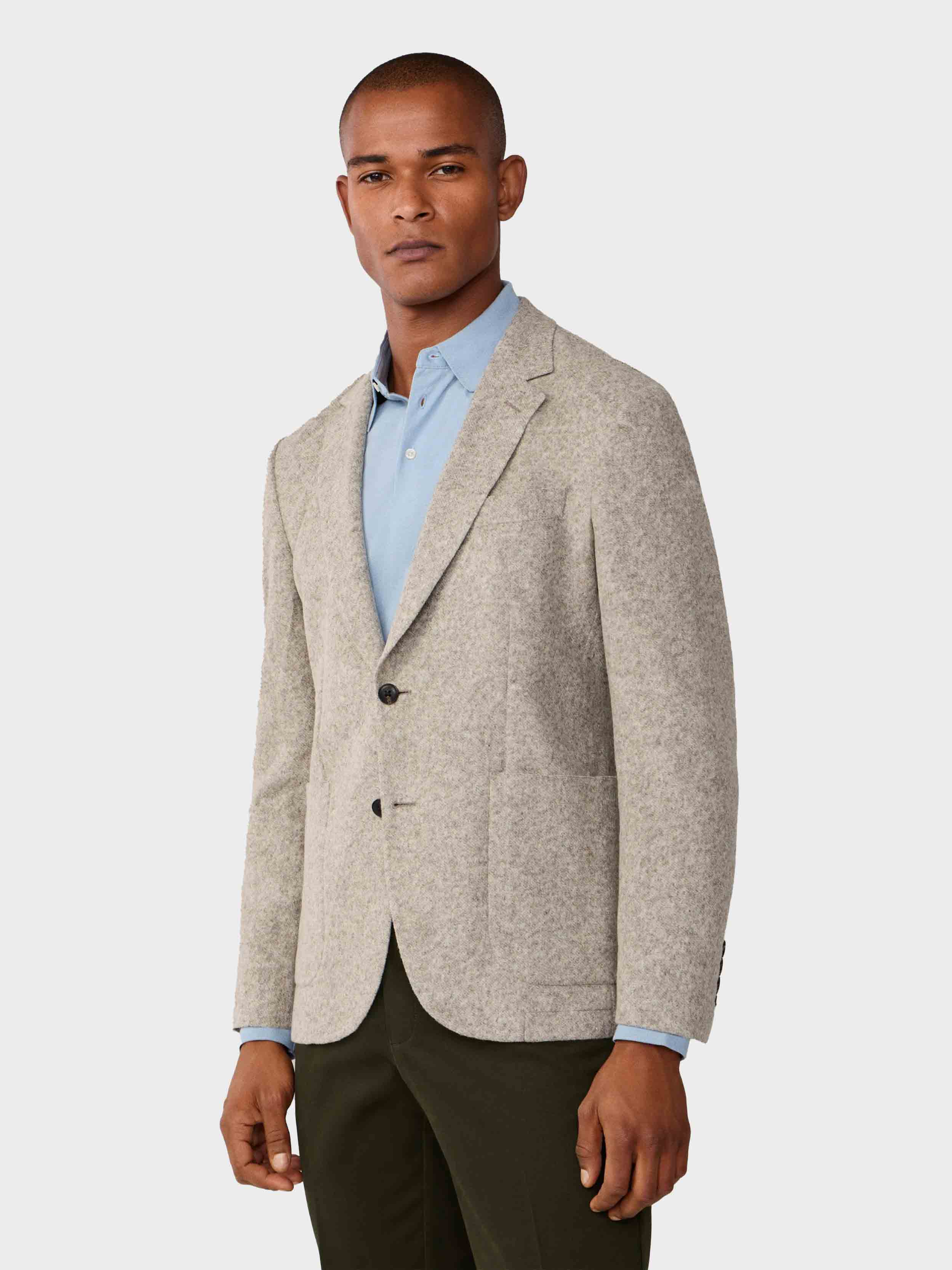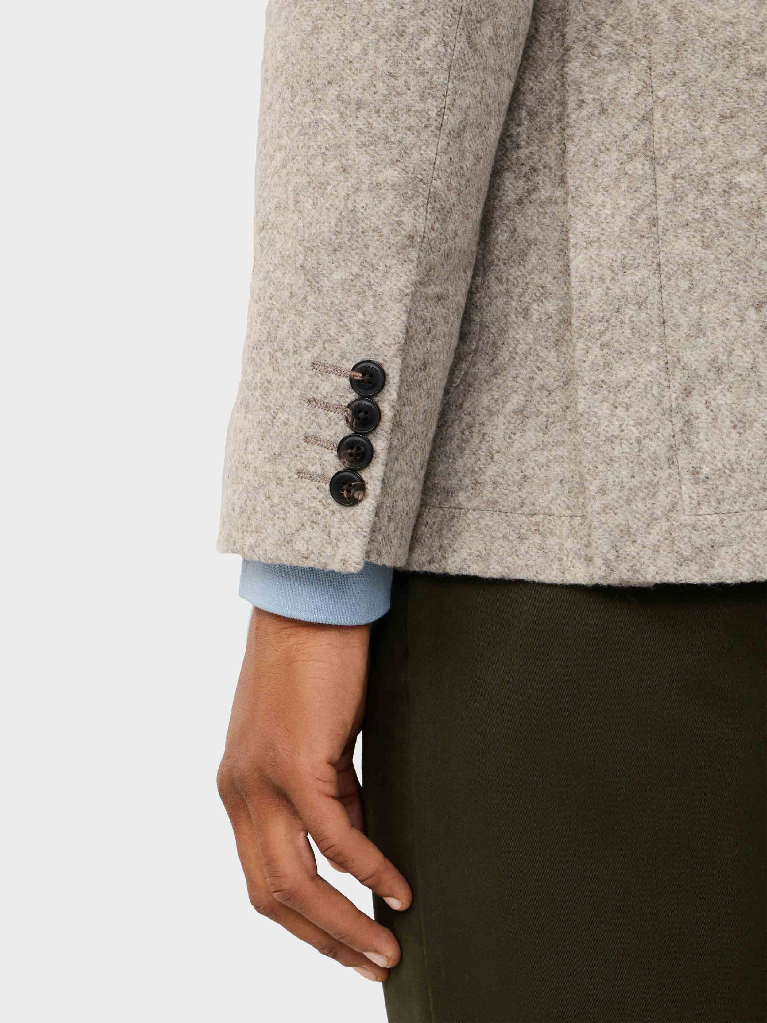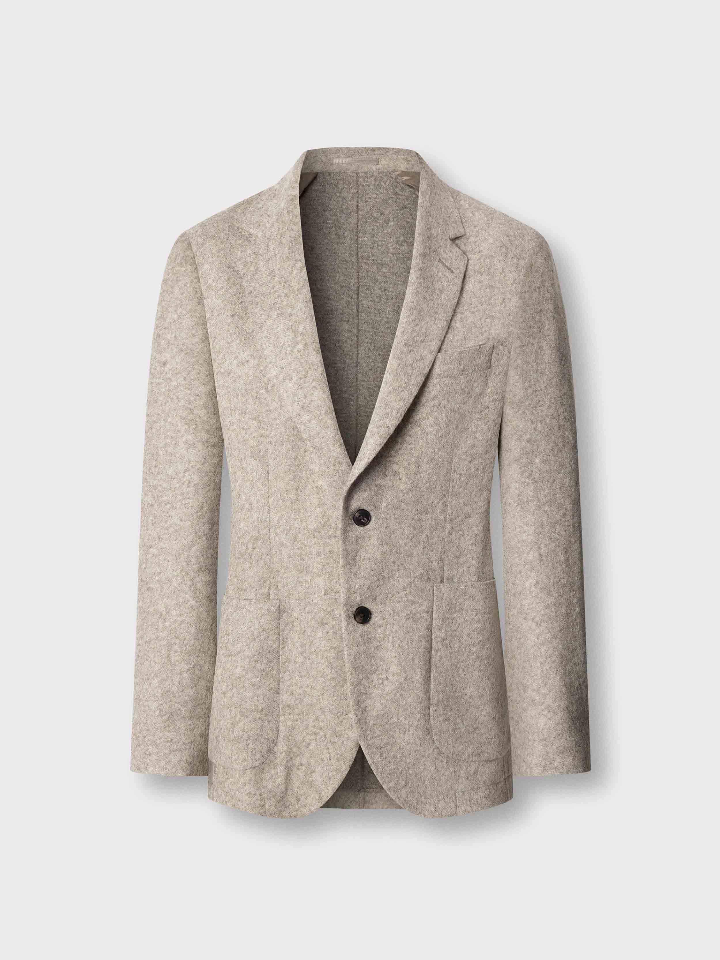 • Features two buttons, a notch lapel, button cuffs, patchpockets, unlined internals