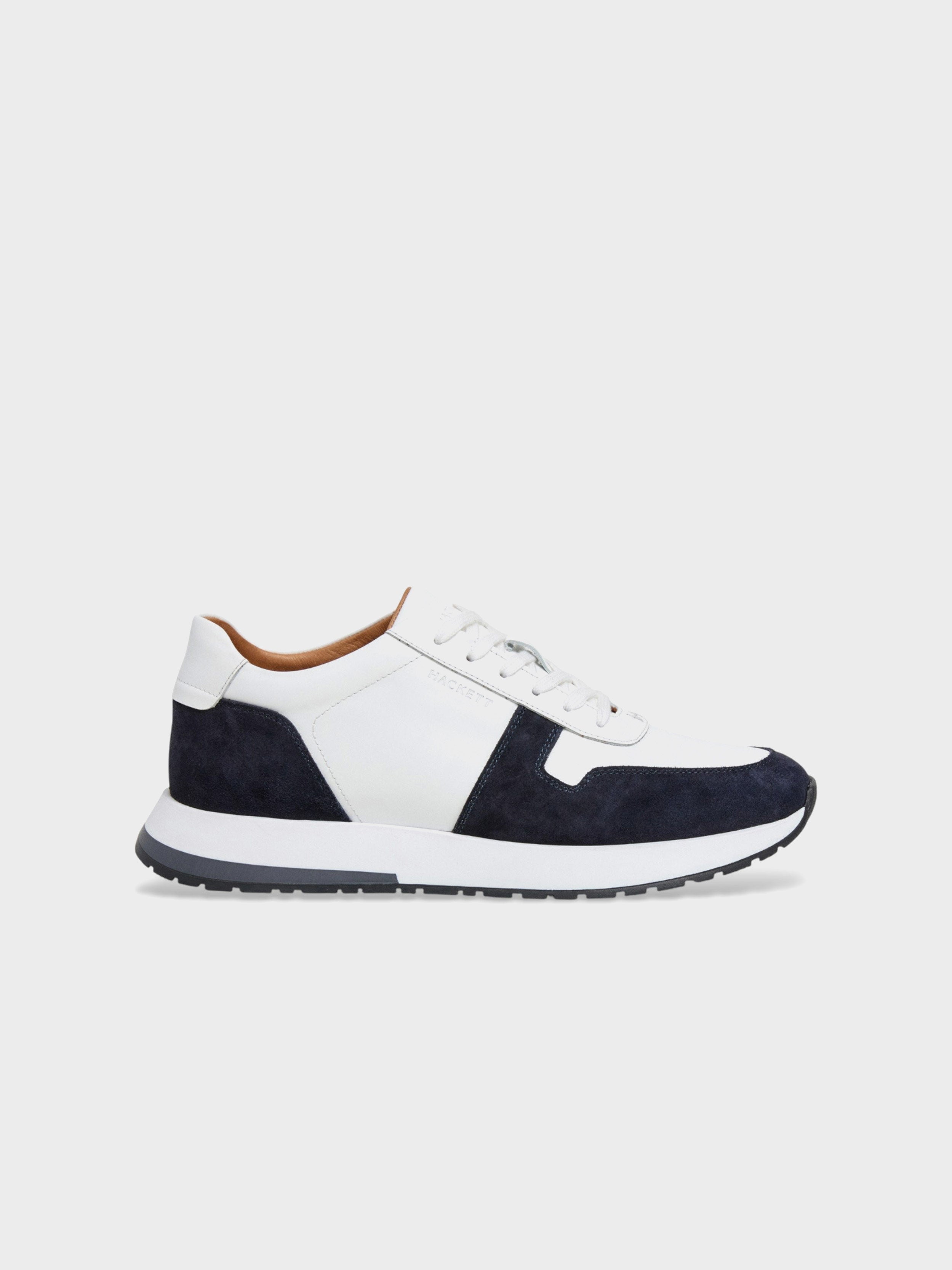 • The Rapid Zephyr trainers are a distinctive casual running style, crafted with a mix of fine leather and contrasting split leather detailing. Featuring an iconic Hackett umbrella logo to the rear, Hackett London embossing to the tongue and the classic Hackett 'H' hand-stitched to the front.