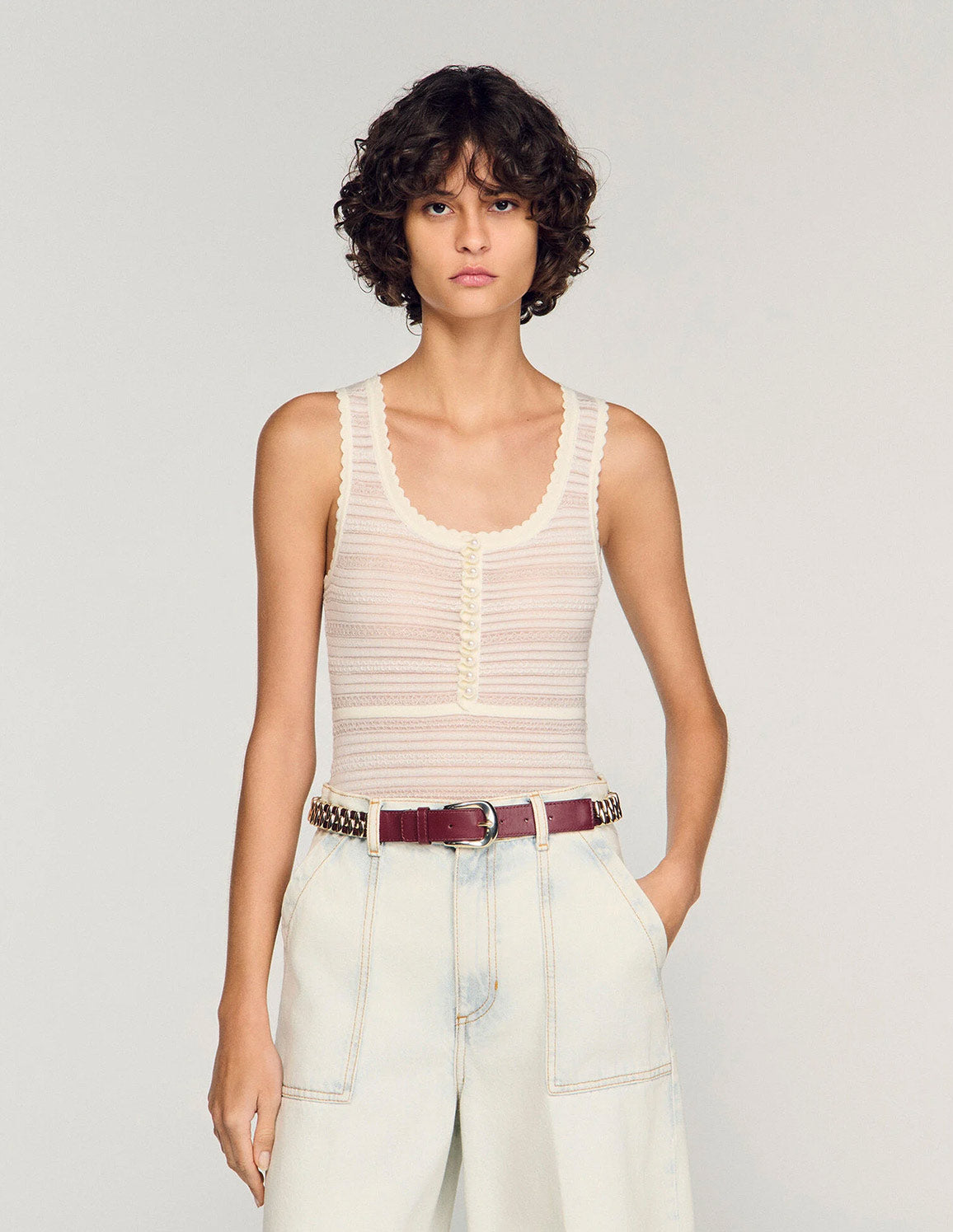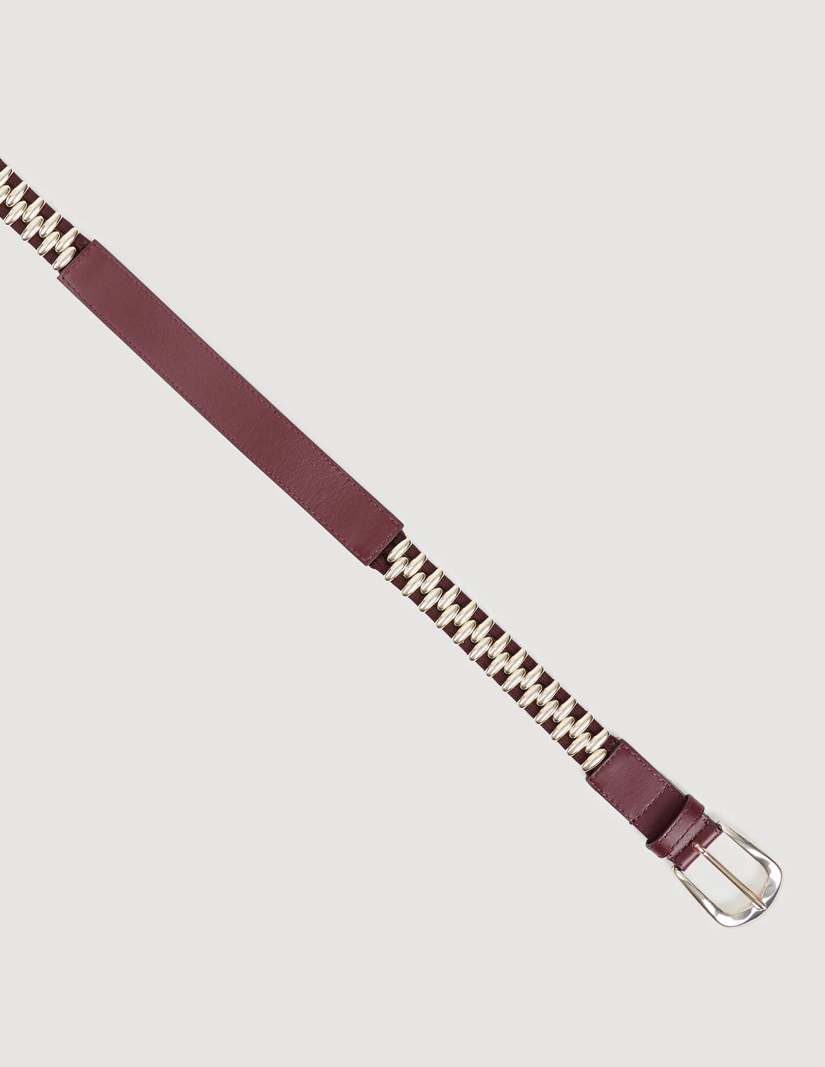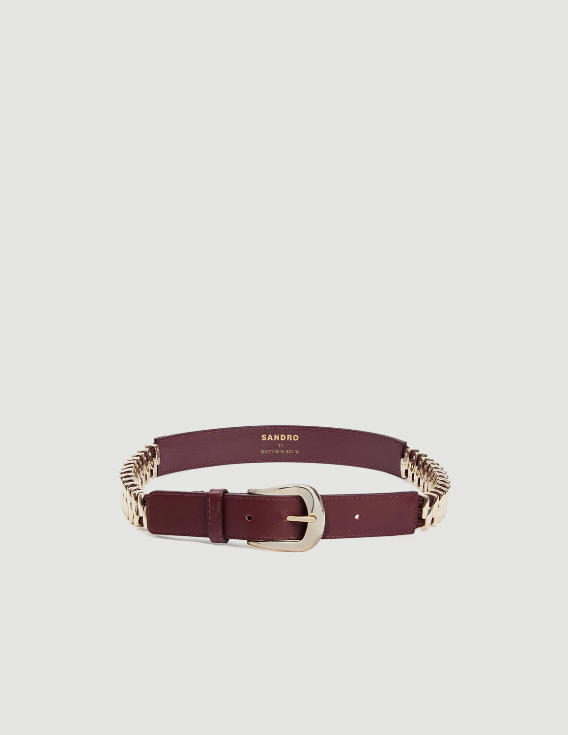 • Smooth leather belt embellished with metal loops and a metal buckle.