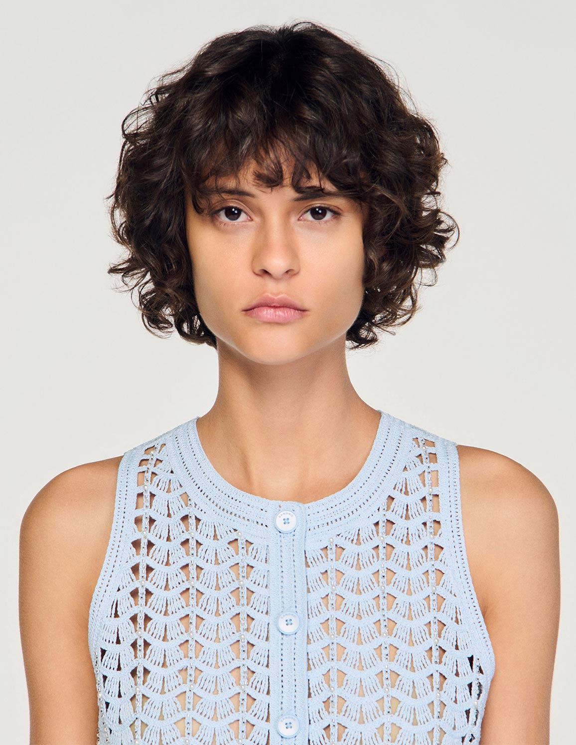 • Sleeveless crochet cardigan with pearls, round neckline and geometric pattern.